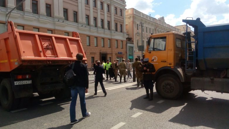 Вход на улицу Тверская в Москве перекрыли спецтехникой до 12:00 по местному времени. К улице также стянуты автозаки и бронетехника. Перекрыты и смежные с Тверской улицы.