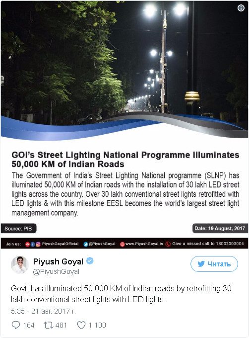Хвастаясь успехами программы освещения индийских улиц, Гойял опубликовал в Twitter фотографию трассы с установленными вдоль нее фонарями. «Правительство осветило 50 тысяч километров дорог Индии, заменив 30-летние уличные фонари на светодиодные», — заявил он.