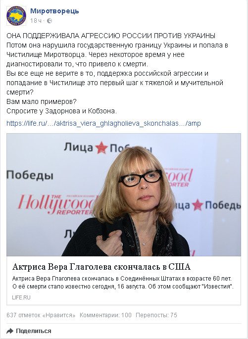 Украинский «Миротворец» поглумился над смертью актрисы Веры Глаголевой
