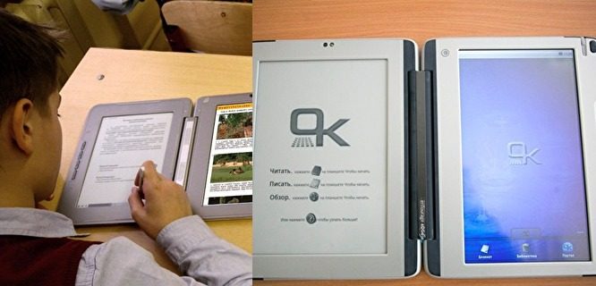Электронный учебник, по замыслу госкорпорации, в перспективе должен заменить школьнику все книги и тетради. Он состоит из двух частей. Справа у него обычный, «сенсорный» экран, который работает только с помощью стилуса. (Здесь стоит напомнить, что глава корпорации Apple Стив Джобс еще в 2005 году говорил о том, что стоит отказаться от стилуса, так как это неудобный девайс, который, например, все время теряется). Слева — экран с электронными чернилами. Оба экрана могут работать одновременно: например, справа школьники открывают учебник, а слева пишут, рисуют схемы и графики. Набор приложений сильно сокращен по сравнению с полноценным планшетом: документы, галерея, калькулятор, календарь, камера, музыка, видео, диктофон, библиотека. Никаких игр и мессенджеров. Нет даже стандартного браузера, но в интернет зайти можно.