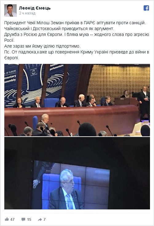 Другой член делегации, депутат Верховной Рады Леонид Емец, на своей странице в Facebook назвал президента Чехии «подлюкой» за это выступление, которое он назвал агитацией в ПАСЕ против санкций. «Дружба с Россией для Европы. И, бляха-муха, ни слова об агрессии России. Но сейчас мы ему идиллию подпортим», — возмутился Емец и позже добавил в сердцах: «Вот, подлюка, говорит, что возвращение Крыма Украине приведет к войне в Европе».