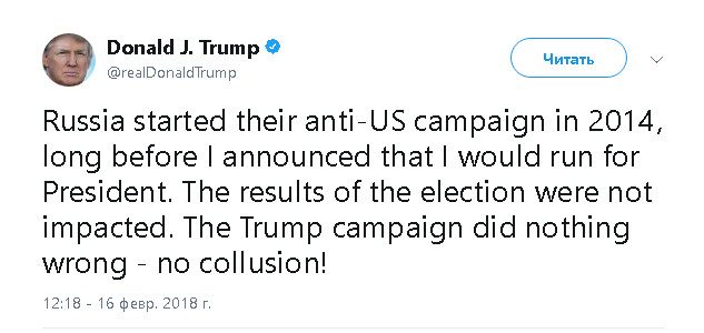 Американский президент Дональд Трамп в своем Twitter прокомментировал решение прокуратуры своей страны, которая обвинила ряд российских граждан во вмешательстве в выборы, которые прошли в США в 2016 году.«Россия начала свою антиамериканскую кампанию в 2014 году задолго до того, как я объявил о своем намерении баллотироваться на пост президента», — написал он. По словам Трампа «на результаты выборов это не повлияло», а во время предвыборной кампании не «сделал ничего неправильного», так как «сговора не было».