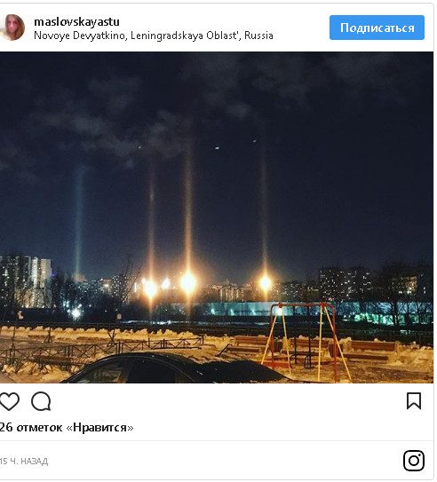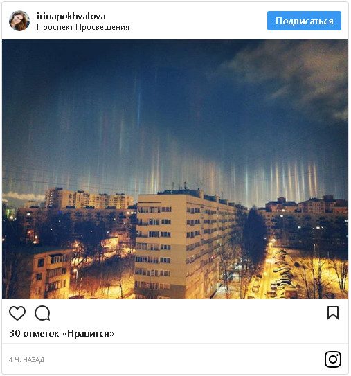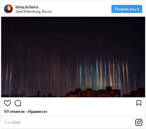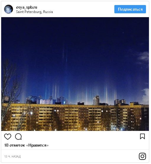 Жители Санкт-Петербурга делятся в социальных сетях фотографиями необычного атмосферного явления — «световых столбов».