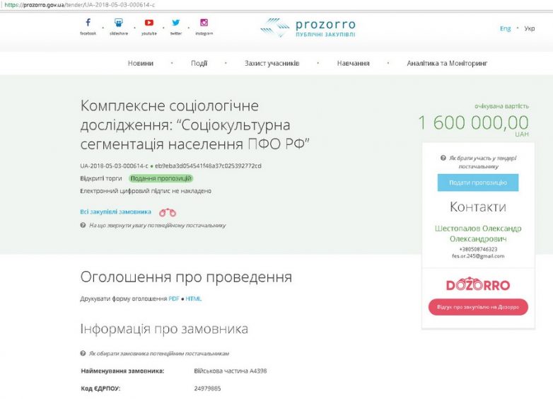 Из документации к тендеру следует, что в качестве заказчика выступает воинская часть А4398. Ранее под этим кодом работал Центр информационно-психологических операций Военно-морских Сил Украины, который был расквартирован в Севастополе. После присоединения Крыма к России центр переехал в город Бровары и стал называться 72-й головной Центр информационно-психологических операций сил специальных операций Украины.
