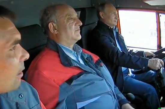 Президент, ставший инициатором этой стройки, получил возможность первым из россиян проехать по мосту. Он вместе с колонной строительной техники отправился на ту сторону — в Крым, где выступил на митинге-концерте по случаю открытия транспортного перехода. Поехал Путин в Крым за рулем грузовика «КамАЗ», посадив рядом с собой генерального директора компании «СГМ-Мост» Александра Островского. Перед отправлением Путин по-гагарински сказал: «Поехали!» Всего в колонне было около 35 машин, среди которых самосвалы, автокраны, цементовозы, цистерны и другая техника со стройки. Вдоль всей трассы Путина с разных точек снимали расставленные видеокамеры.