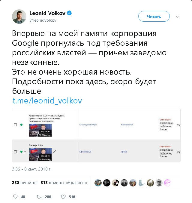 По его словам, корпорация впервые в своей истории «удовлетворила незаконные требования российских властей». Волков выложил в Twitter скриншоты, указывающие, что некоторые ролики были заблокированы по «юридическим основаниям».