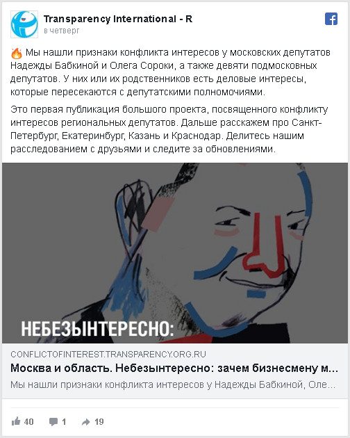 «Трансперенси Интернешнл» уже подала обращение по каждому из депутатов в прокуратуру. Оттуда запросы по Бабкиной были перенаправлены в комиссию Мосгордумы по контролю за депутатскими декларациями доходов и имущества. Там сообщили, что депутаты не уведомляли о наличии у них заинтересованности, которая может привести к конфликту интересов.