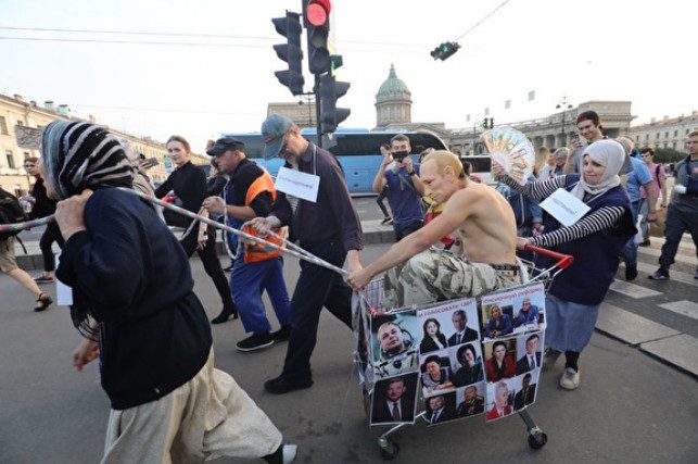 Голый по пояс мужчина в маске президента РФ Владимира Путина проехал по Невскому проспекту на повозке, запряженной людьми предпенсионного возраста. Таким образом участники движения «Весна» показали «честное изображение» пенсионной реформы.