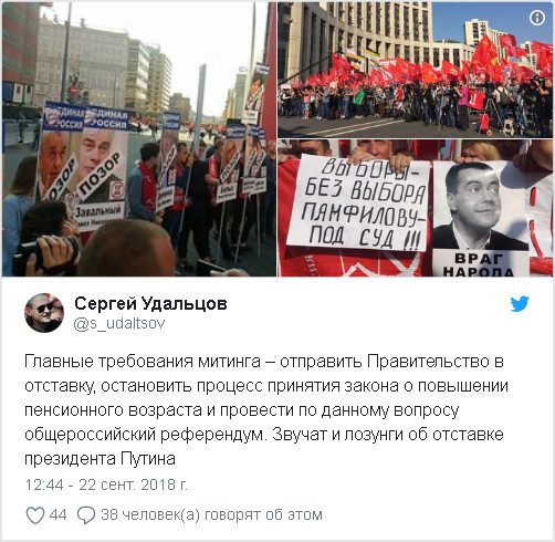 «Главные требования митинга — отправить Правительство в отставку, остановить процесс принятия закона о повышении пенсионного возраста и провести по данному вопросу общероссийский референдум. Звучат и лозунги об отставке президента Путина», — сообщил Удальцов.