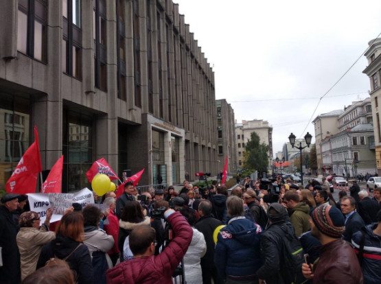 В день заседания Совета Федерации московское отделение «Яблока» со своим председателем Сергеем Митрохиным провело серию пикетов против пенсионной реформы. Активисты пришли к зданию Совфеда с плакатами «Пенсионная „реформа“ — ограбление народа» и «Пенсионная „реформа“ — позор „Единой России“. В акции протеста также приняли участие депутаты от КПРФ, активисты „Левого фронта“, профсоюзов и ряда других общественных организаций. Как говорится в Twitter координатора „Левого фронта“ Сергея Удальцова, к зданию СФ на Большой Дмитровке собрались около 500 человек. Представители „Левого фронта“ держали плакаты „Повышение пенсионного возраста — это геноцид!“, а также портреты инициаторов реформы с надписью „Враг народа“.