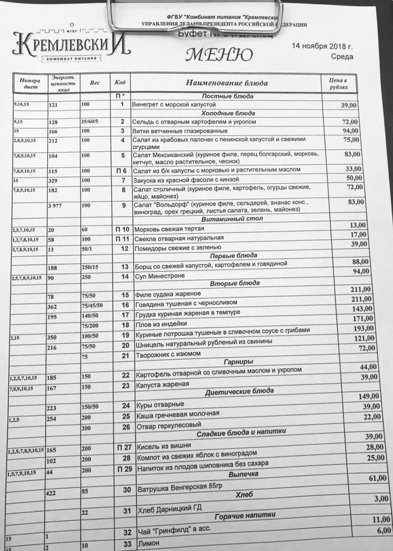 Ранее в управлении делами президента России сообщили, что блюда, подающиеся в буфетах и столовых комбината питания управделами, создает рабочая группа, в которую входят заведующие производствами и технологи подразделений.Трехнедельное меню состоит из холодных блюд и закусок, первых, вторых, овощных, мясных, рыбных блюд, гарниров из овощей и круп, напитков из фруктов и ягод, хлебобулочных изделий, а также выпечки собственного производства.