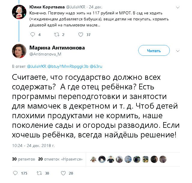 Позднее она добавила еще один комментарий. «Считаете, что государство должно всех содержать? А где отец ребенка? Есть программы переподготовки и занятости для мамочек в декретном и т.д. Чтоб детей плохими продуктами не кормить, наше поколение сады и огороды разводило. Если хочешь ребенка, всегда найдешь решение!» — говорится в комментарии министра к записи в Twitter.