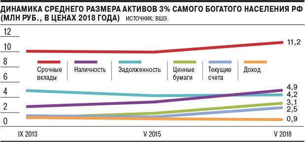 В результате аналитики ВШЭ и Института исследований и экспертизы ВЭБа, сопоставив данные микрообследования потребительских финансов населения и макроэкономическую статистику, впервые оценили долю совокупных финансовых активов, ценных бумаг, срочных вкладов, текущих счетов и наличности, сконцентрированных в руках самых богатых 3% россиян,— а также их доли в общей сумме задолженности населения. При этом разница между распределением активов и сбережений, рассчитанным на основе микрообследований (по методике сопоставимых с рассчитываемым Росстатом распределением в двадцатипроцентных доходных группах), и дооценкой на 3% самых богатых граждан разительна.