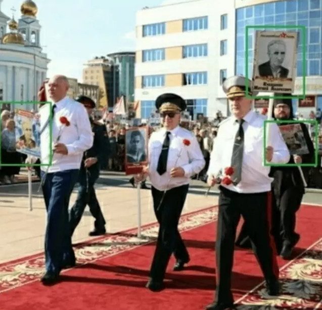 По существу это шествие вообще может быть без фото, поскольку их НИКТО не видит. Всем участникам шествия они повёрнуты обратной стороной или торцом. Когда я у сына и невестки, носившего на «Бессмертный полк» фото моего отца (его деда), моих тестя и тёщи (его деда с бабкой) спросил, что он видел, он ответил: «Ничего, кроме спин». Должны быть специальные «Стены памяти», где люди смогут увидеть победителей, а шествовать с таким же успехом можно и с майскими веточками — результат один.
