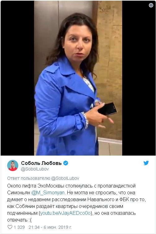 Любовь Соболь опубликовала видеозапись разговора с Симоньян в своем твиттере. Она раскритиковала журналистку за то, что беременность мешает ей дать комментарий на вопрос о коррупции, но дает ходить на передачи «Эха Москвы».