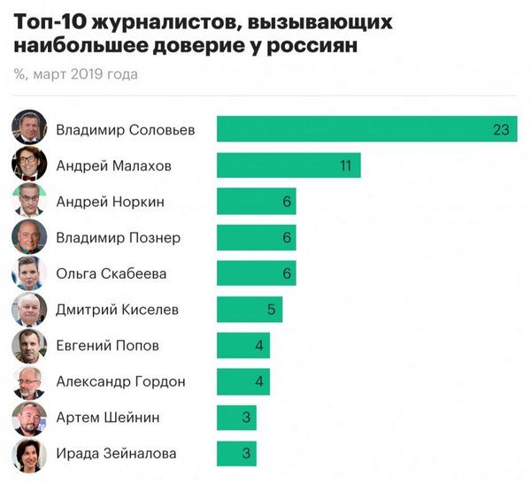 Годом ранее в топ наиболее авторитетных для россиян журналистов попали те же фигуры — Соловьев (11,1% доверяющих им респондентов), Андрей Малахов (8,2%) и Владимир Познер (7,2%). За ними с 2% следовали телеведущие Дмитрий Киселев, Ольга Скабеева и Евгений Попов.