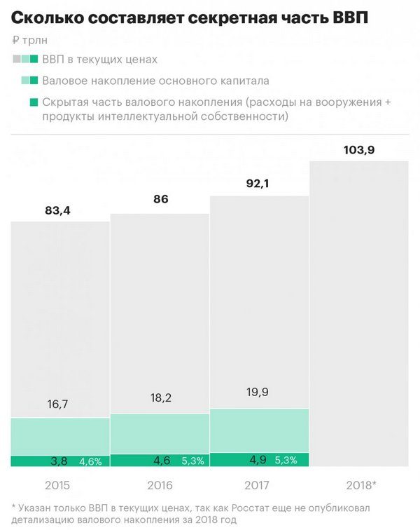 Росстат третий год публикует данные об объемах, структуре и динамике ВВП по единой международной методологии СНС 2008 («Система национальных счетов 2008 года»). Согласно ей в валовое накопление основного капитала включены расходы на системы вооружения длительного пользования (самолеты, корабли, танки и т.д.), а также продукты интеллектуальной собственности (научные исследования и разработки, затраты на разведку запасов полезных ископаемых, создание компьютерного ПО и баз данных).Росстат в статистическом представлении валового накопления свернул данные о расходах по двум этим категориям, и понять, сколько в отдельности потрачено на военные системы, а сколько — на исследования и разработки, невозможно.