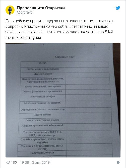 20:20 Опубликован протокол допроса по делу о «массовых беспорядках». Следователи выясняют у задержанных, пришли ли они на акцию протеста «идейно» или «за деньги», были ли они одни или с кем-то, брали ли с собой оружие, пользовались ли мессенджерами «для координации действий с другими протестующими».