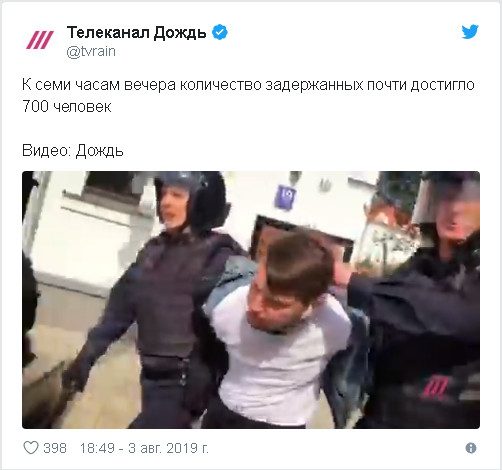 17:55 Ректор Московского педагогического государственного университета (МПГУ) Алексей Лубков пригрозил студентам отчислением, если их привлекут к ответственности за участие в несогласованных акциях протеста. 17:52 Количество задержанных в столице во время второй массовой акции «Вернем себе право на выборы» превысило 600 человек, передает «ОВД-Инфо». И это не предел. Задержания продолжаются на Пушкинской и Трубной площадях, на бульварах и на выходах из метро.