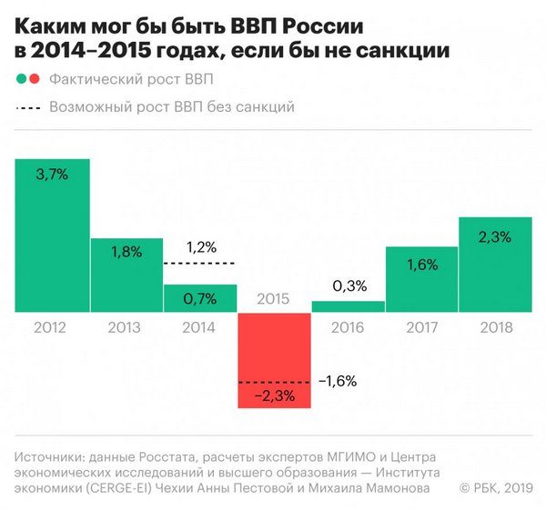 В то же время эксперты Bloomberg в конце 2018 года подсчитали, что из-за санкций и ряда других факторов (таких, как структурные изменения в экономике и замедление общемировых темпов роста) российский ВВП не вырос на дополнительные 6% с 2014 года.