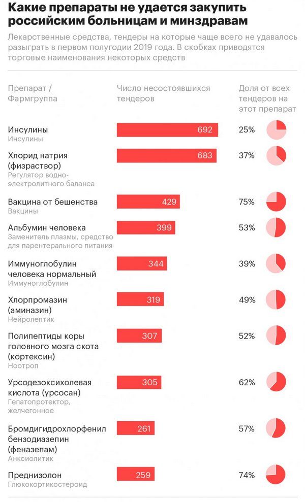 По данным ОНФ, более 45 тыс. закупок лекарств в стране осталось без участников торгов. Больше всего не состоялось закупок препарата антипсихотического действия хлорпромазин (251 закупка). Его применяют при разных состояниях психомоторного возбуждения. На втором месте — вакцина для профилактики бешенства (не состоялось 157 закупок). Третье место — иммуноглобулин человека против клещевого энцефалита (144 закупки).