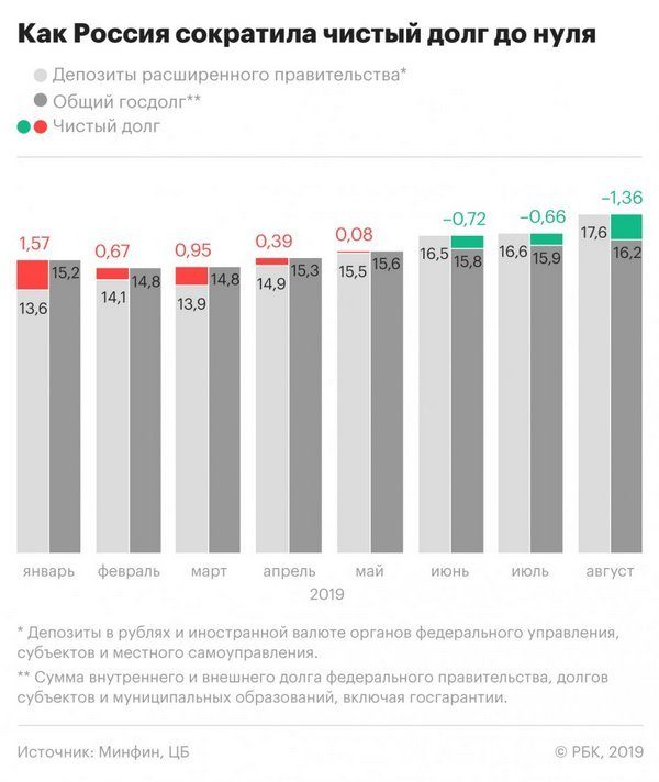 По состоянию на 1 августа 2019 года чистые активы расширенного правительства (депозиты минус долговые обязательства) составили 1,25% прогнозного ВВП 2019 года (по оценке Минэкономразвития). На 1 января 2019 года госдолг в расширенном понимании превышал госактивы на 1,5% ВВП.