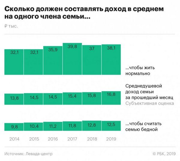 Для поддержания нормального уровня жизни российской семье нужно примерно 38,1 тыс. руб. на человека, согласно результатам опроса. Авторы исследования также попросили респондентов назвать объем среднедушевого дохода их семьи за прошедший месяц, и он оказался в 2,3 раза ниже оценки нормального дохода — 16,8 тыс. руб. Нормальный в восприятии россиян доход получают только 7% опрошенных, следует из результатов опроса.