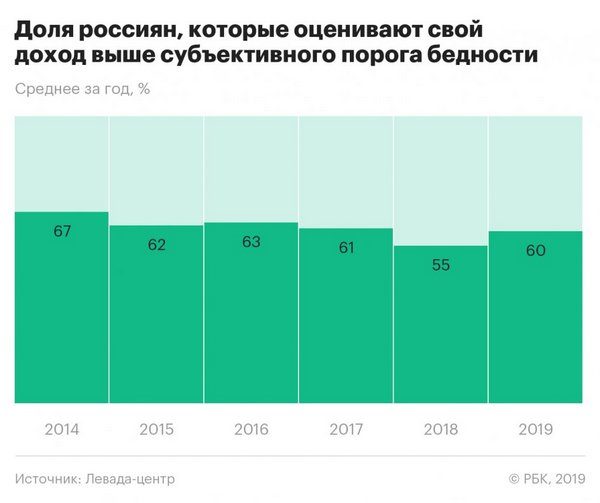 Согласно результатам исследования Левада-центра, 40% респондентов имеют ежемесячный доход ниже субъективной границы бедности, то есть 12,5 тыс. руб. в месяц. Доля россиян, получающих доход выше порога бедности (60%), в 2019 году оказалась ниже максимального уровня, зафиксированного в 2014 году (67%), но выше значения прошлого года (55%), следует из результатов исследования.