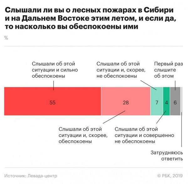 Больше всего россиян беспокоят гибель леса и природы (22%), а также животных (20%), проблемы экологии, страдания людей, бездействие властей (по 17%). Среди прочего респонденты упоминали коррупцию и скрытие незаконной вырубки (12%), экономический ущерб (7%), масштабы бедствия (6%), плохую работу лесных служб и страх перед стихией (по 4%).