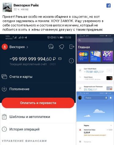 «Привет! Раньше особо не искала общения в соцсетях, но вот сегодня задумалась и поняла: хочу замуж. Ищу уверенного в себе состоятельного и состоявшегося мужчину, который не побоится взять в жены отчаянную девушку с таким приданым», — иронизирует Виктория.