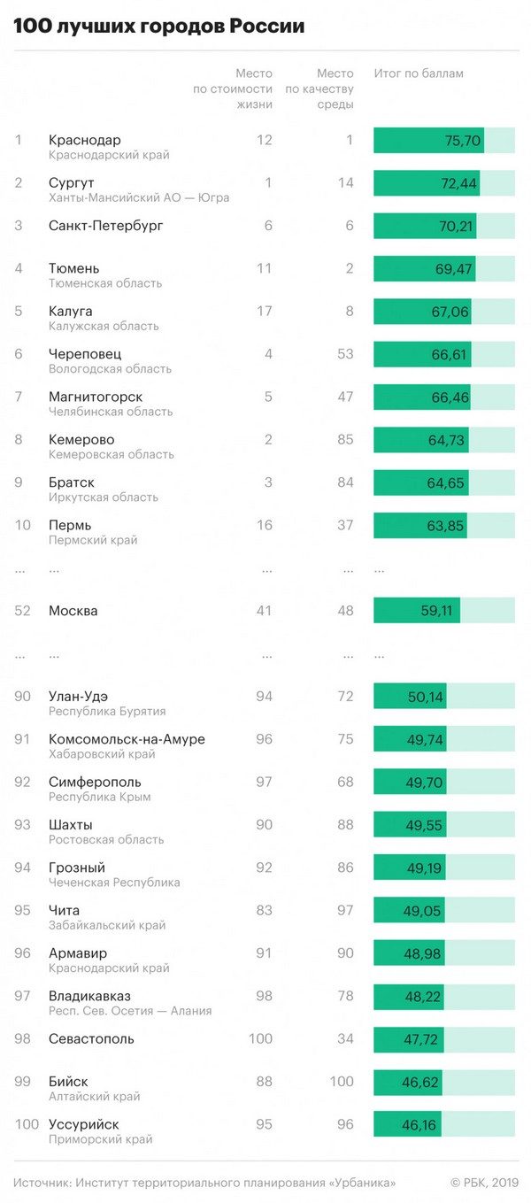 * Только пять городов из ста урбанисты отнесли и к комфортным, и к доступным по стоимости проживания одновременно: в порядке убывания это Краснодар, Сургут, Санкт-Петербург, Тюмень и Калуга.
