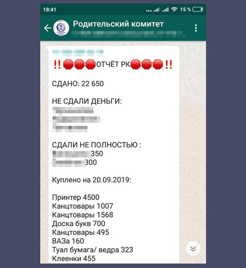 Факт сбора средств председатель родительского комитета отрицает, а из чата, по словам Валерии, за всё время был удалён только один человек.— Это мой личный чат, он не имеет к школе никакого отношения. Я его создала и делаю там что хочу, — добавила она.