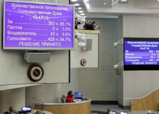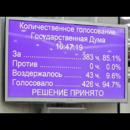 Государственная дума одобрила закон о поправке в Конституцию. За проголосовали 383 депутата, высказавшихся против не было, воздержались 43.