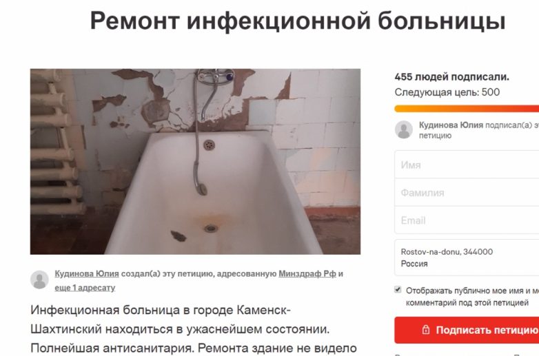 «Инфекционная больница в городе Каменск-Шахтинский находится в ужаснейшем состоянии. Полнейшая антисанитария. Ремонта здание не видело уже очень много лет. Подпишите петицию. Давайте вместе достучимся до властей. Сколько можно терпеть и лечить своих детей в таких условиях? Или власти не знают о сложившейся ситуации? Давайте им сообщим! Мы должны объединиться! Хватит терпеть подобное наплевательское отношение к нам!»