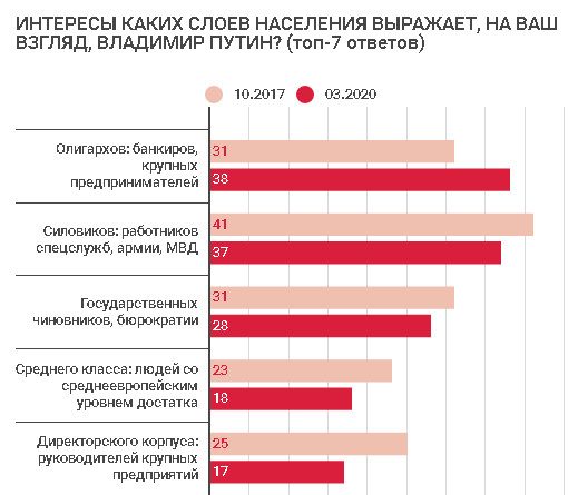 Мнение о том, что Путин выражает интересы крупного бизнеса, связано с дискуссией о падении цен на нефть и обесценивании рубля, говорит директор «Левада-центра» Лев Гудков: «Эта тема очень широко обсуждалась в интернете, а сами события больше всего ударили по наиболее информированным слоям населения и молодежи. Симпатии к президенту тоже больше всего снизились у молодежи. И впервые именно за счет социальных сетей, где это широко обсуждалось, последовала такая реакция на политико-экономические события». Авторитет силовиков поддерживается за счет периферии, т. е. сохраняется в консервативных группах населения, объясняет социолог. Что же касается снижения положительных оценок Путина, то это особенно заметно по сравнению с 2008 и 2015 гг., когда был пик симпатий к нему, отмечает Гудков. К этому, по его словам, добавилась и негативная реакция на поправку об обнулении президентских сроков, все-таки примерно 55–58% россиян считают, что власть должна меняться, иначе это приводит к потере эффективности управления государством. «В любом случае у 60% населения нейтральное отношение к президенту, это несущая конструкция, возможно, эквивалент терпения: ничего сделать нельзя, ничего ни плохого, ни хорошего сказать не могу. Это и есть базовое отношение к власти», – резюмирует социолог.