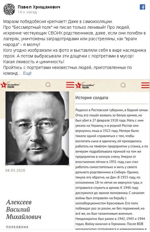 Фото появилось в профиле с именем полковника СССР Василия Михайловича Алексеева, сообщает издание «Подъем». На данный момент такой страницы с портретом Гиммлера на сайте движения уже нет, она была удалена. Но координатор движения «Бессмертный полк» в Ростове-на-Дону Андрей Кудряков подтвердил эту информацию РИА «Новости».