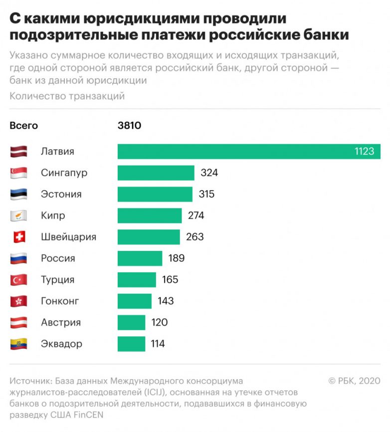 В «российской выборке» 5% от общего числа транзакций пришлись на операции, которые проводились между российскими банками. Например, из Промсвязьбанка в Росбанк, из Новикомбанка в ВЭБ, из Московского кредитного банка в «Русский стандарт» и т.д. Всего речь идет о 189 таких переводах денежных средств на общую сумму около $760 млн. Поскольку перевод осуществлялся в долларах, в нем обязательно принимал участие американский банк-корреспондент. Этот банк и сообщал в FinCEN о подозрительной операции.Остальные 95% транзакций, связанных с Россией, были переводами из других юрисдикций в Россию или из России в другие юрисдикции. Больше всего таких операций (исходящих и входящих) было совершено с Латвией (1123, или 29%), Сингапуром (323), Эстонией (315), Кипром (274).