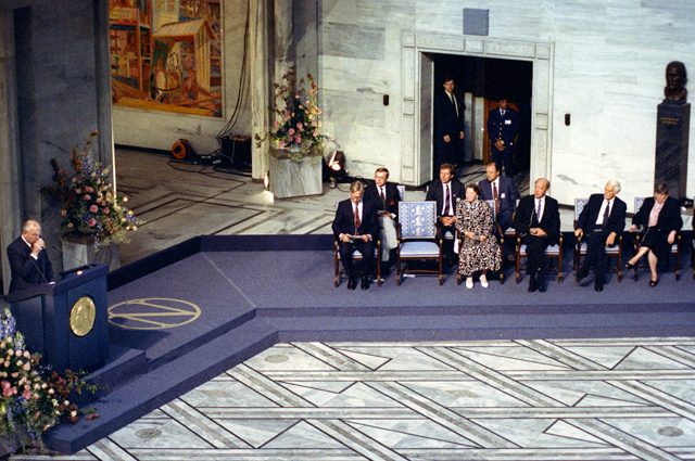 Президент СССР М. С. Горбачёв, лауреат Нобелевской премии мира за 1990 год, выступает с традиционной Нобелевской лекцией в Осло