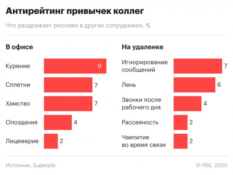 Курение, сплетни, хамство, громкие и пустые разговоры, а также лицемерие — все это раздражает россиян в их коллегах. Исследование провел сервис по поиску работы Superjob. У офисных и удаленных сотрудников разные нелюбимые привычки коллег.