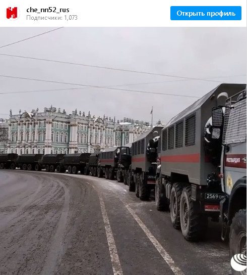 11.43. В Санкт-Петербурге у перекрытой Дворцовой площади выстроились в колонну автозаки, готовясь принять десятки задержанных.