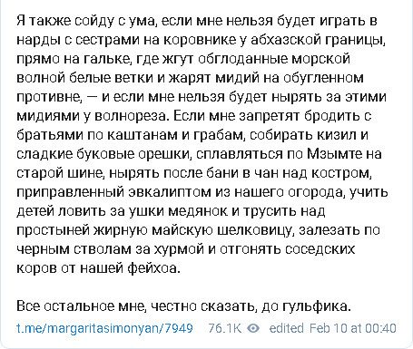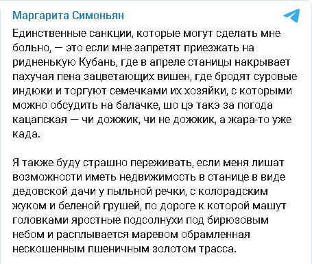 «Единственные санкции, которые могут сделать мне больно, — это если мне запретят приезжать на ридненькую Кубань, где в апреле станицы накрывает пахучая пена зацветающих вишен, где бродят суровые индюки и торгуют семечками их хозяйки, с которыми можно обсудить на балачке, шо цэ такэ за погода кацапская — чи дожжик, чи не дожжик, а жара-то уже када», — в частности говорится в этом посте.