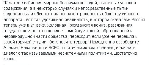 «Жестокие избиения мирных безоружных людей, пыточные условия содержания, а в некоторых случаях и непосредственные пытки задержанных и абсолютная неподконтрольность обществу силового аппарата — вот та чудовищная реальность, в которой оказалась Россия теперь уже в 21 веке. Холодная Гражданская война, развязанная государством по отношению к самой думающей, образованной и неравнодушной части общества, переходит, если уже не перешла к своей горячей стадии», — констатируют музыканты, призывая остановить террор, освободить Алексея Навального и всех политических заключенных, и начать диалог с так называемыми несистемными политиками.