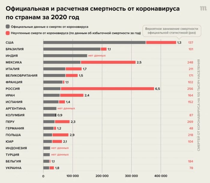 Ранее вице-премьер Татьяна Голикова признала, что избыточная смертность в 2020 году на 81% связана с коронавирусом, не объяснив, с чем связаны остальные 19%. Между тем по более детализированным данным департамента здравоохранения Москвы, с вирусом связаны 98–100% «избыточных смертей». Если считать, что на самом деле почти вся избыточная смертность вызвана эпидемией, можно предположить, что смертей от коронавируса в 2020 году было в 6,3 раза больше, чем 57 тысяч, о которых официально говорили власти. Это значит, что Россия в 2020 году заняла второе (после США) место по числу жертв коронавируса и вошла в пятерку самых пострадавших из расчета на душу населения. А к началу февраля, скорее всего, Россия вышла на первое место в мире по числу смертей на 100 тысяч населения.
