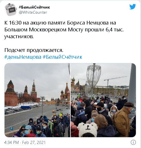 По данным «Белого счетчика» к 16.30 мск, на акцию в Москве пришли не менее 6,4 тысяч человек. Поток людей начал снижаться. На 18.30 мск на Большом Москворецком Мосту прошли 8,7 тыс. участников акции, поток людей не прекращался.