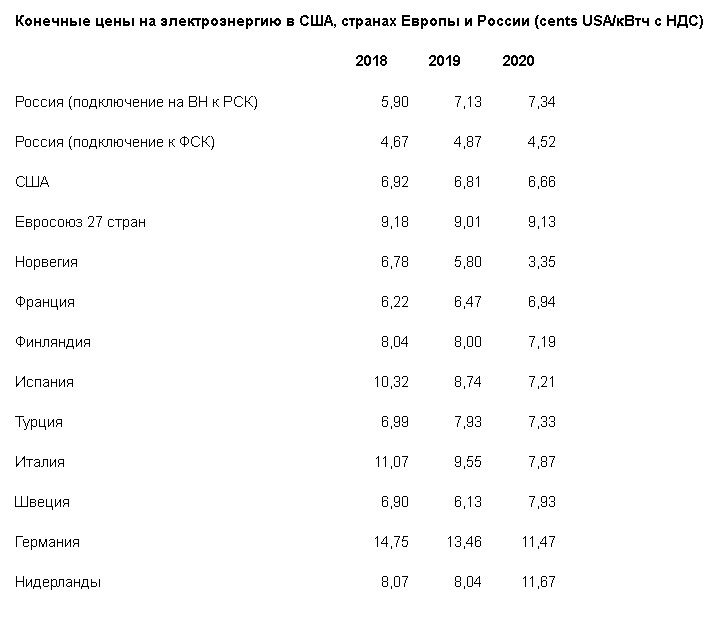 Вместе с тем остальные 30% промышленного потребления в России приходится на энергоемких потребителей, подключенных к магистральным сетям ФСК. Для них цена в 2020 году составила 4,52 цента. При этом сопоставить цены для крупных энергоемких предприятий в РФ и за рубежом проблематично, поскольку данные по ним в открытой статистике, будь то ЕС или США, отсутствуют, отмечают в «Сообществе потребителей энергии»: «Некоторые документы и исследования, а также примеры по зарубежным активам российских компаний указывают, что цены для энергоемких предприятий за рубежом примерно вдвое ниже средних цен для промышленности в этих странах и нередко оказываются ниже российского уровня».