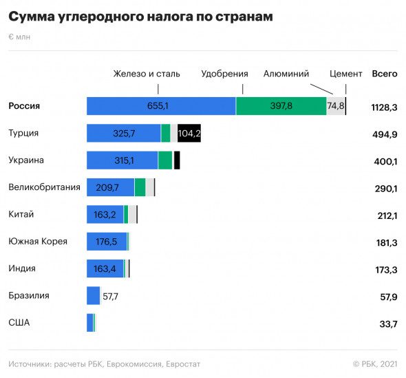 По расчетам, годовые потери от углеродного налога в отношении российских товаров (€1,13 млрд) будут примерно такими же, как в сумме потери следующих в списке Турции, Украины и Великобритании.