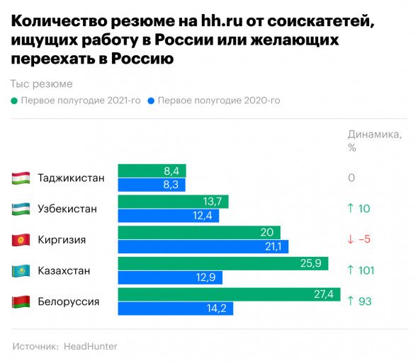 Росло лишь количество резюме от соискателей из Казахстана и Белоруссии. Но, как пояснила директор департамента аналитических бизнес-решений HeadHunter Наталья Данина, в большинстве случав соискатели из этих стран рассматривают вакансии в профессиях белых воротничков и могут работать удаленно, тогда как в качестве рабочего, строительного, административного персонала обычно привлекают мигрантов из Средней Азии. «Первая волна пандемии повлекла за собой снижение миграционного прироста — работники из стран Средней Азии стали массово возвращаться домой, и, как мы видим по динамике резюме, обратный тренд летом 2021 года еще даже не наметился. Рост числа резюме соискателей из стран Средней Азии на 2% означает лишь, что отток прошлого года едва компенсировался», — указала Данина. Она напомнила, что регулярные авиаперевозки между Россией и странами Средней Азии возобновились лишь в апреле 2021 года, а уже в мае «в полную силу заявила о себе третья волна пандемии».
