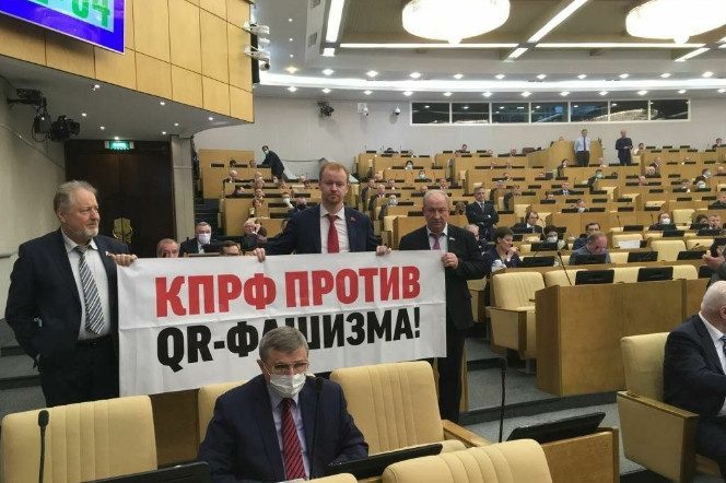 В Госдуме перед рассмотрением резонансного законопроекта о QR-кодах для посещения общественных мест произошла потасовка между коммунистами и единороссами. Поводом стало то, что депутаты от КПРФ Денис Парфенов, Валерий Рашкин и Сергей Обухов развернули плакат «КПРФ против QR-фашизма».