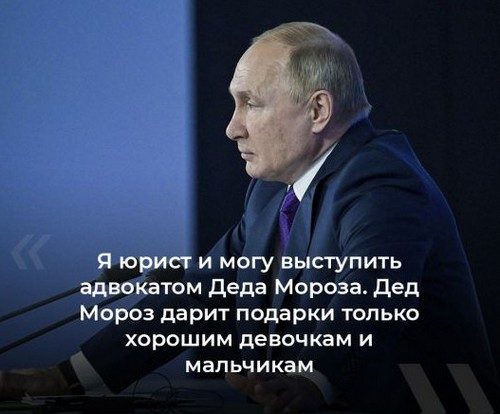 Корреспондент из Вологодской области рассказал, что некий юрист из Петербурга подал в суд на Деда Мороза за то, что он не выполняет его желания уже 23 года. И, дескать, нормально ли заниматься подобным хайпом?«Я тоже юрист из Петербурга, — с улыбкой заметил Путин, — поэтому выступлю в качестве адвоката и напомню истцу, что Дед Мороз исполняет желания и дарит подарки только хорошим девочкам и мальчикам. Пусть он проанализирует свое поведение и, может быть, найдет то, что мешает Деду Морозу его одаривать. Это будет основная линия защиты. А что касается хайпа, главное, чтобы он не был злым».