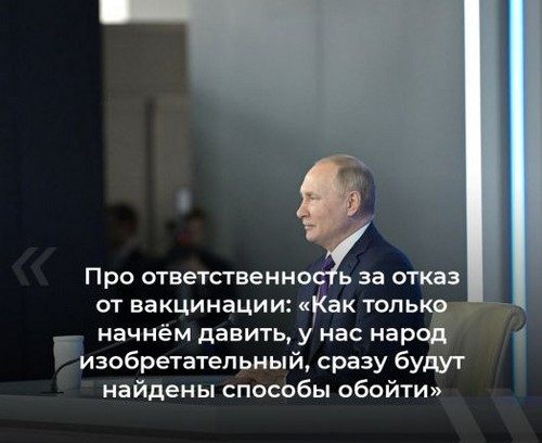 Конечно, тема пандемии стала одной из основных на пресс-конференции. 70 млн россиян сделали прививку, 59,4% составляет коллективный иммунитет, но этого недостаточно, заметил президент. «В некоторых странах говорят, что нужен коллективный иммунитет в 90-95%», — подчеркнул Путин. Он уточнил, что только 1% переболевших ковидом заболевают повторно. А из вакцинированных заболевают 3-4%.Однако заставлять людей насильно делать прививки не будут, подчеркнул президент: «Нам нужно терпеливо разъяснять необходимость принятия определенных мер. Доходчиво и с уважением».